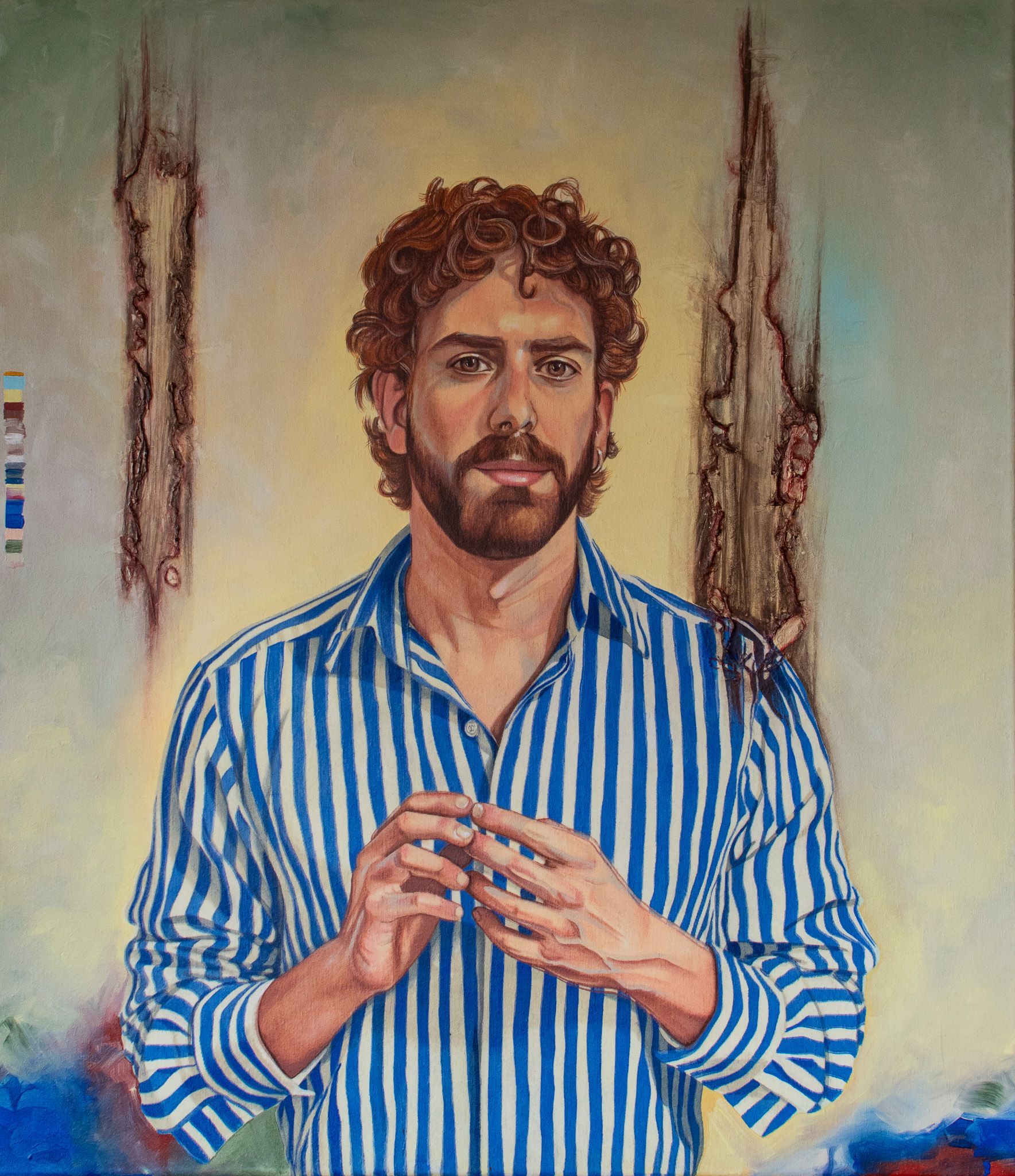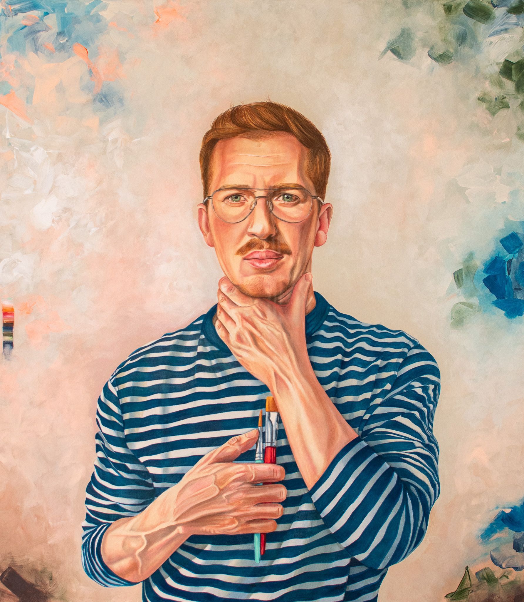 Die Portraitierten erscheinen im besten Licht, makellos und verführerisch, diese Darstellungsweise impliziert die Verlockungen einer Dating App. Eine weitere Anknüpfung an die Digitalisierung ist meine Technik; die Leinwand ist mit einem seideähnlichen Stoff bespannt, so erscheint die Oberfläche screenartig.