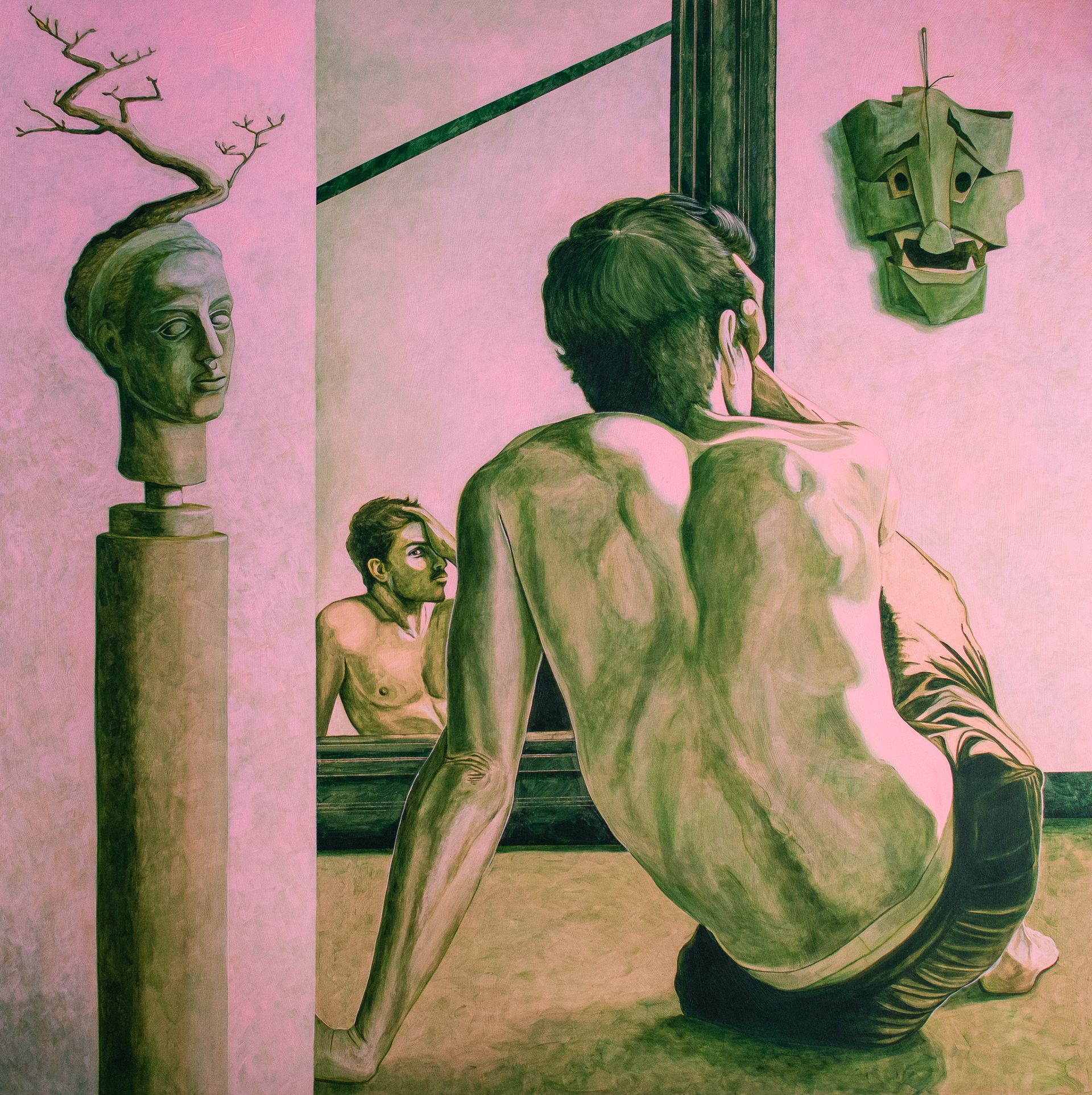 Ein männlicher Akt inmitten eines surrealen Raumes, wird von einer eingerahmten Vanitas-Darstellung begleitet. In dieser Szenerie verschwimmen die Grenzen zwischen Raum und Psyche. Der magrittische Himmel, scharfkantig und abrupt abgeschnitten, verstärkt den Eindruck eines zerbrochenen Horizonts.